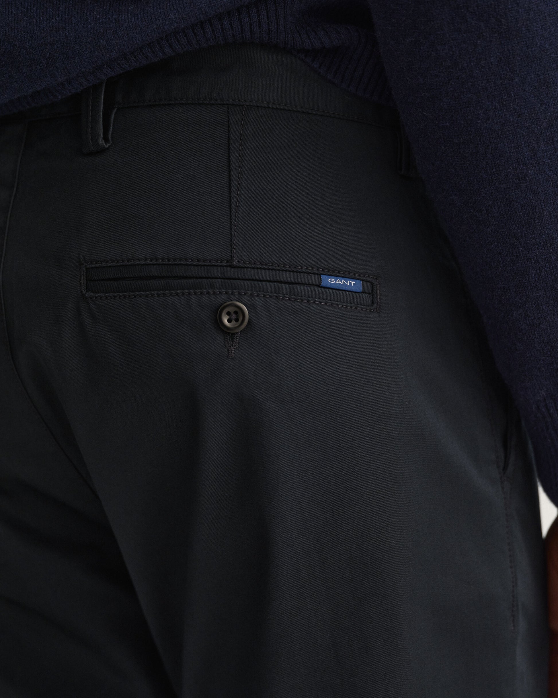 The Slim Twill Chino is Gants slim fit chino, made of 61% Organic Cotton, 37% Cotton, 2% Elastane for comfort and durability. It features a pocket lining made of 100% cotton, woven GANT logo label at back pocket and finished with chambray lining and bound inner seams.