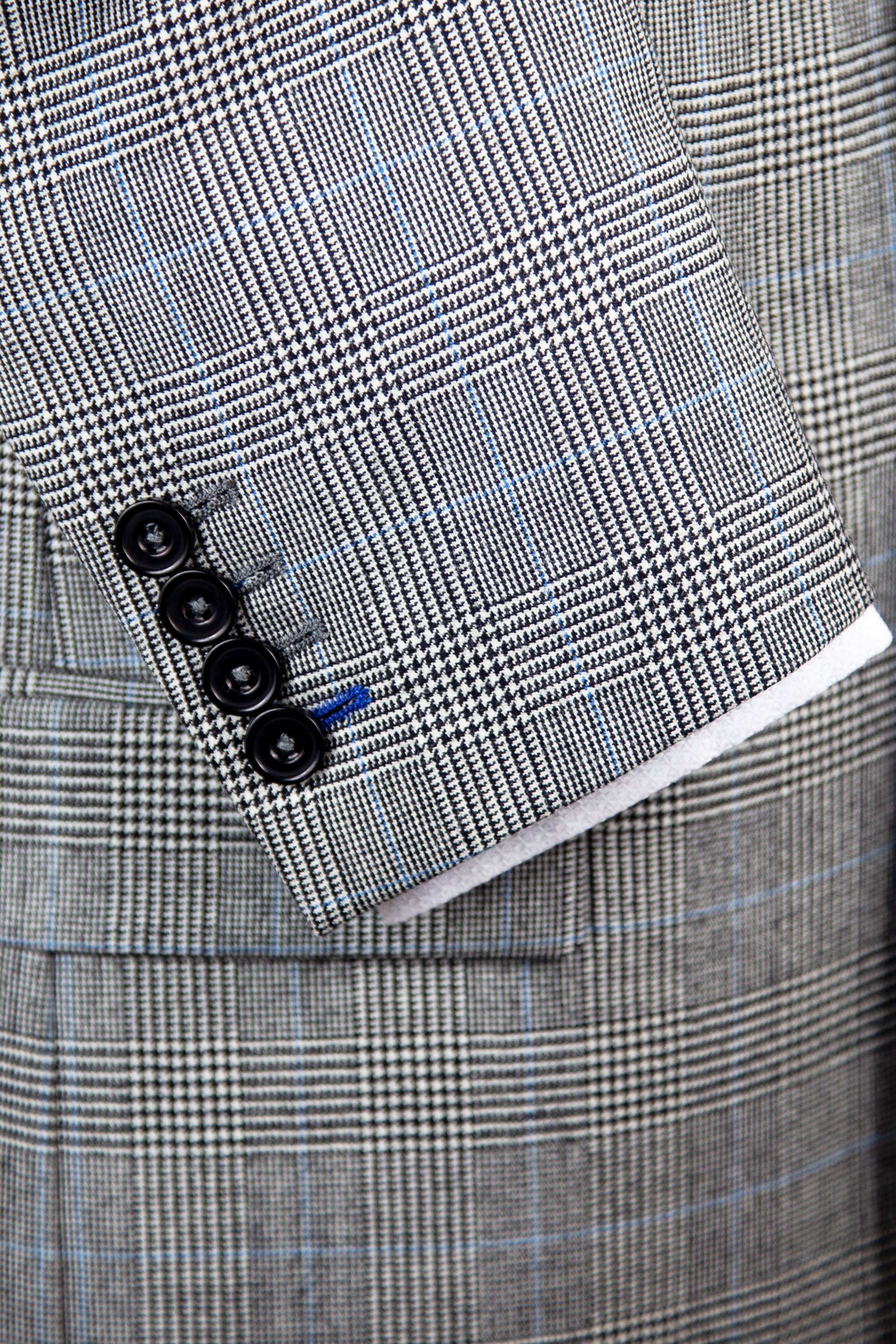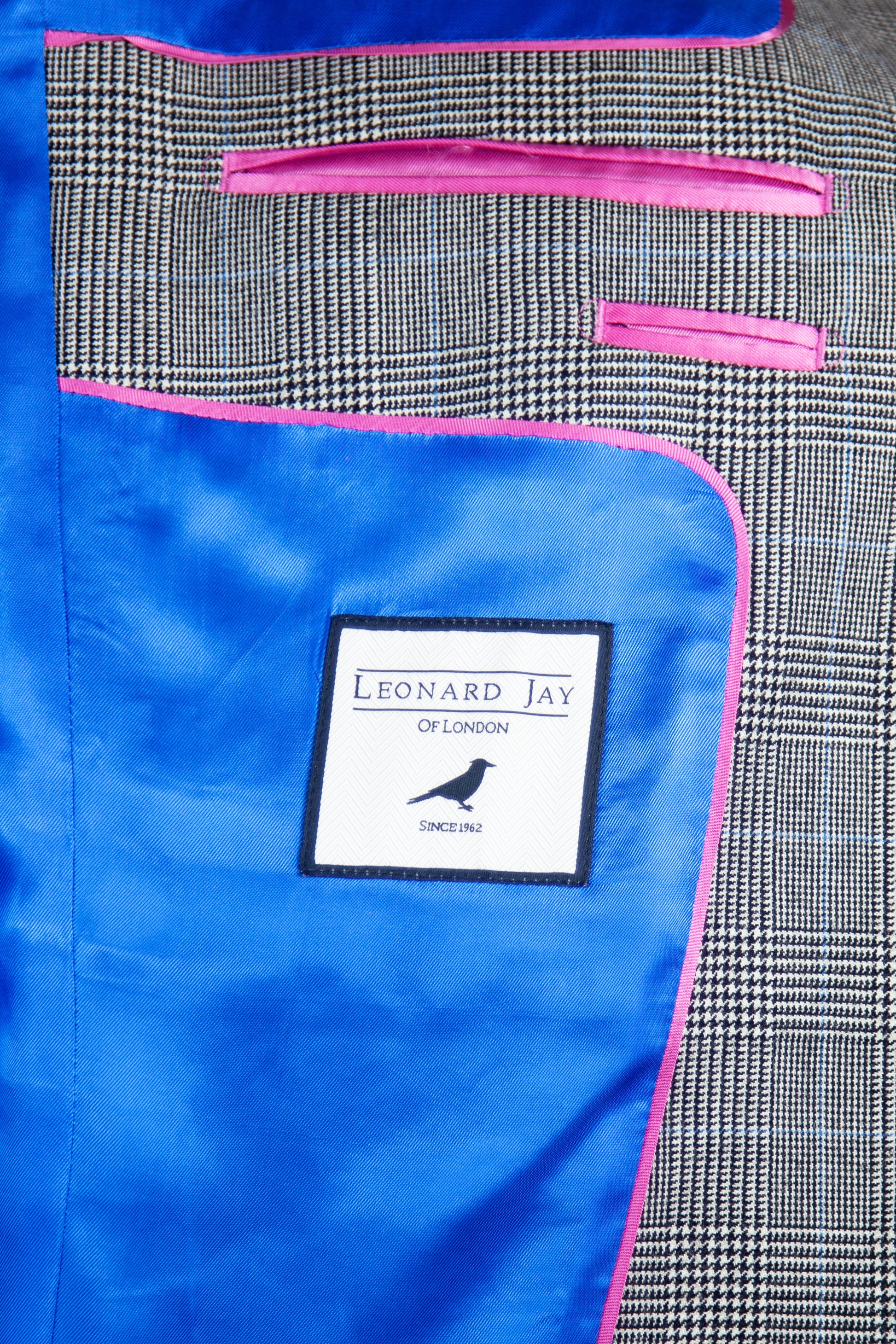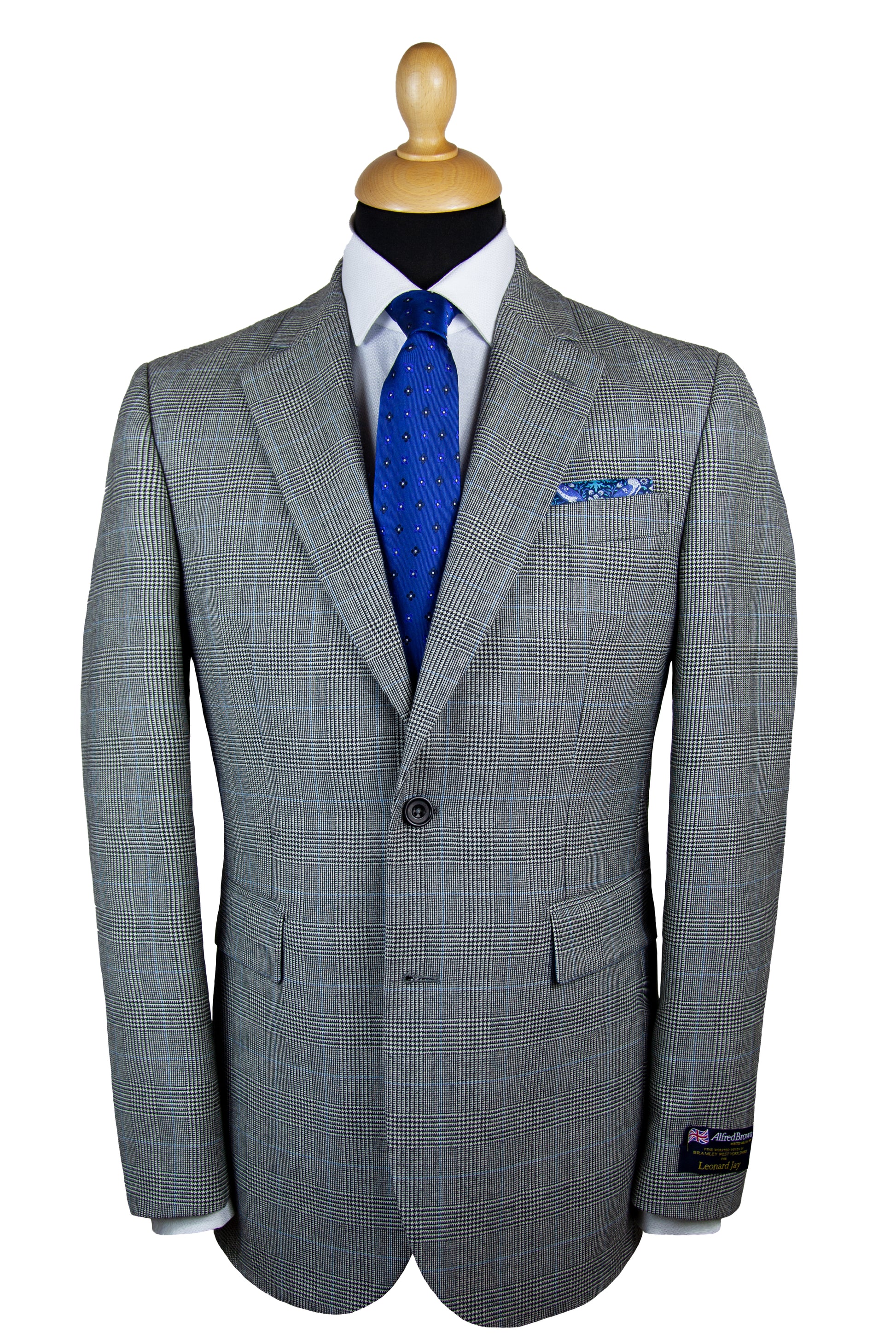 Our 'Brooke' is a Light Grey Prince Of Wales classic fit single breasted suit, made of premium pure wool for comfort and breathability. Jacket features 4 button working cuffs, straight pockets, 100% viscose piano facing Royal Blue lining, and Royal Blue under collar felt and contrasting sham to match lining. It is complemented by a flat fronted classic fit trouser with belt loops. This suit is designed with London fine worsted woven in Bramley West Yorkshire and made in our High grade European factory.