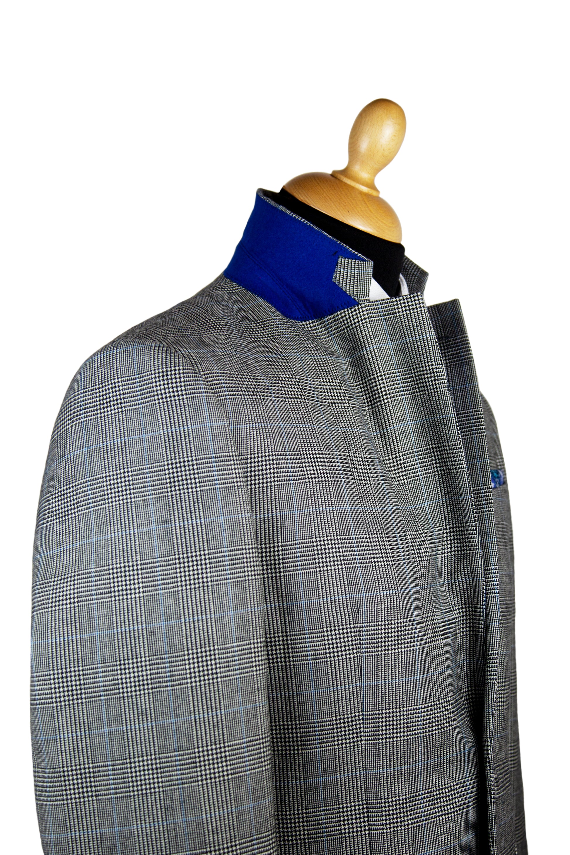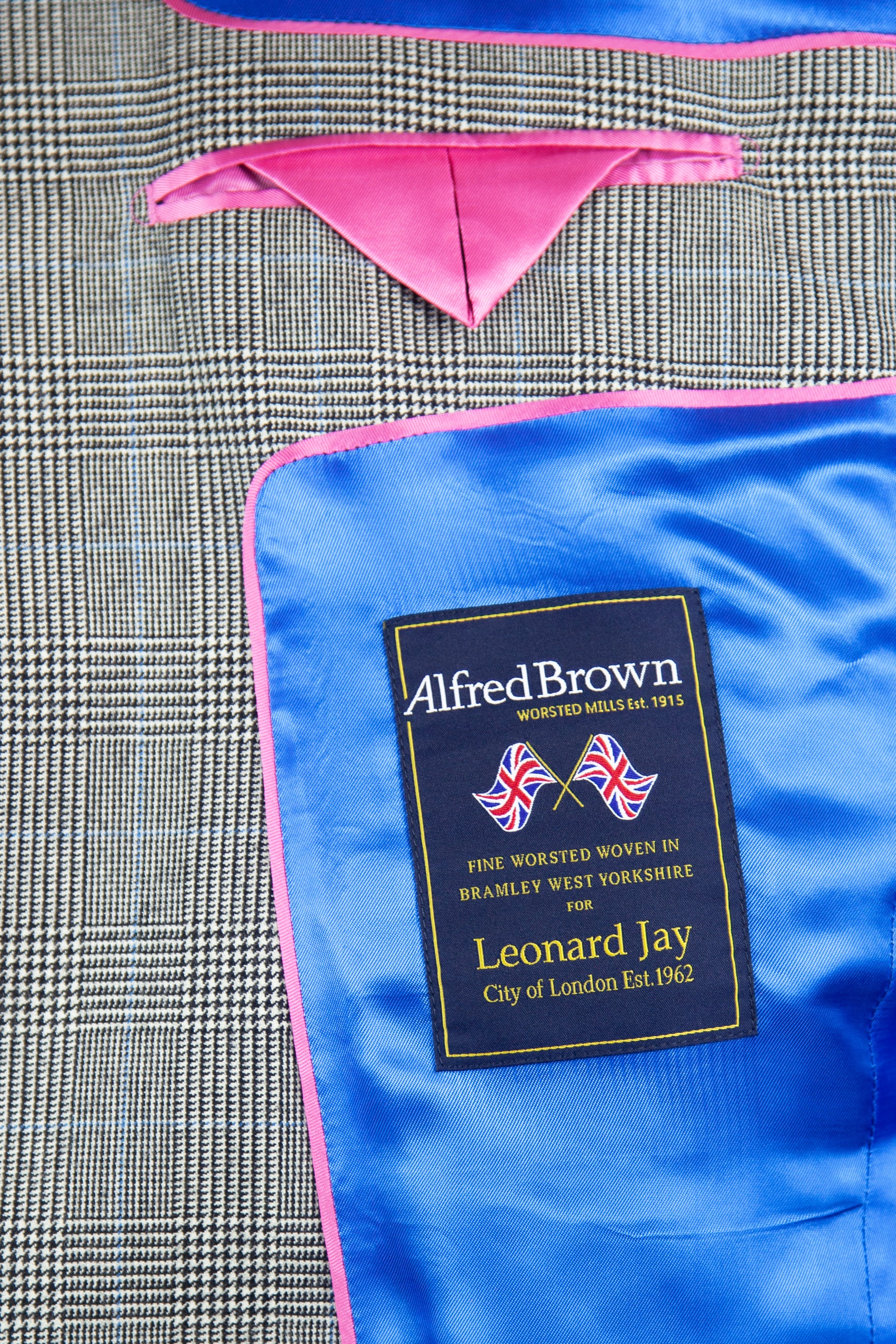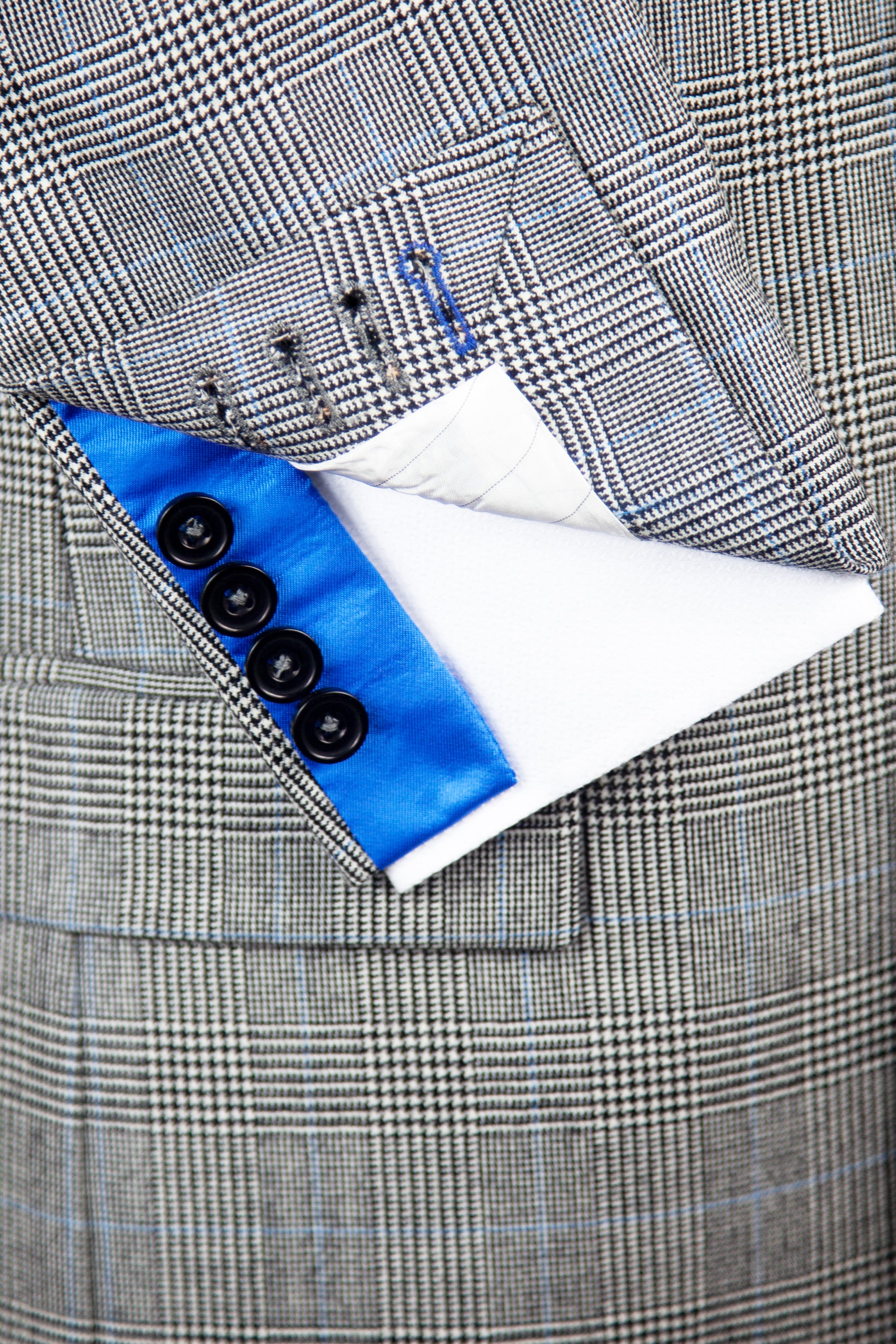 Our 'Brooke' is a Light Grey Prince Of Wales classic fit single breasted suit, made of premium pure wool for comfort and breathability. Jacket features 4 button working cuffs, straight pockets, 100% viscose piano facing Royal Blue lining, and Royal Blue under collar felt and contrasting sham to match lining. It is complemented by a flat fronted classic fit trouser with belt loops. This suit is designed with London fine worsted woven in Bramley West Yorkshire and made in our High grade European factory.