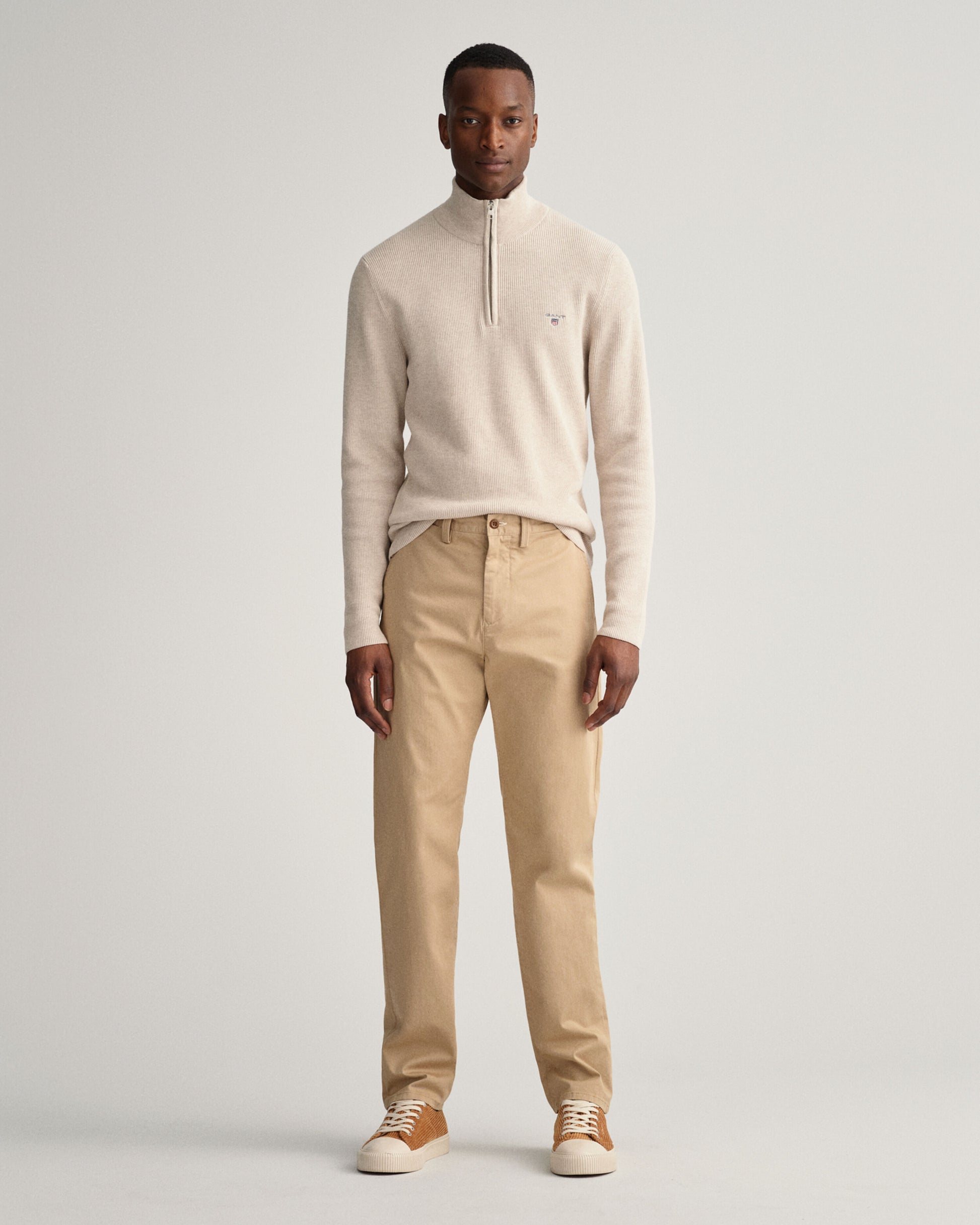 The Regular Chino is Gants regular fit chino, made of 61% Organic Cotton, 37% Cotton, 2% Elastane for comfort and durability. It features a pocket lining made of 100% cotton, woven GANT logo label at back pocket and finished with chambray lining and bound inner seams.