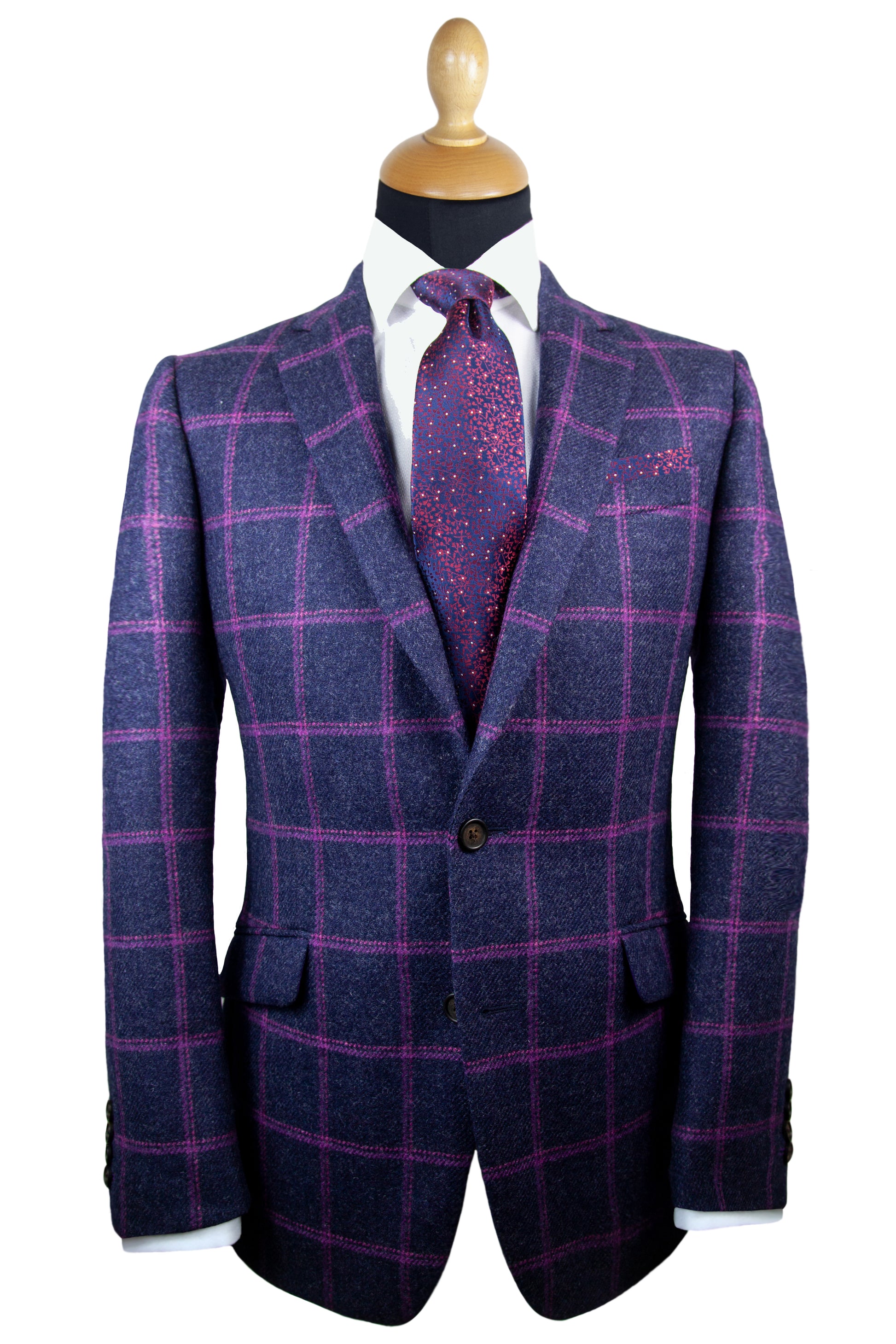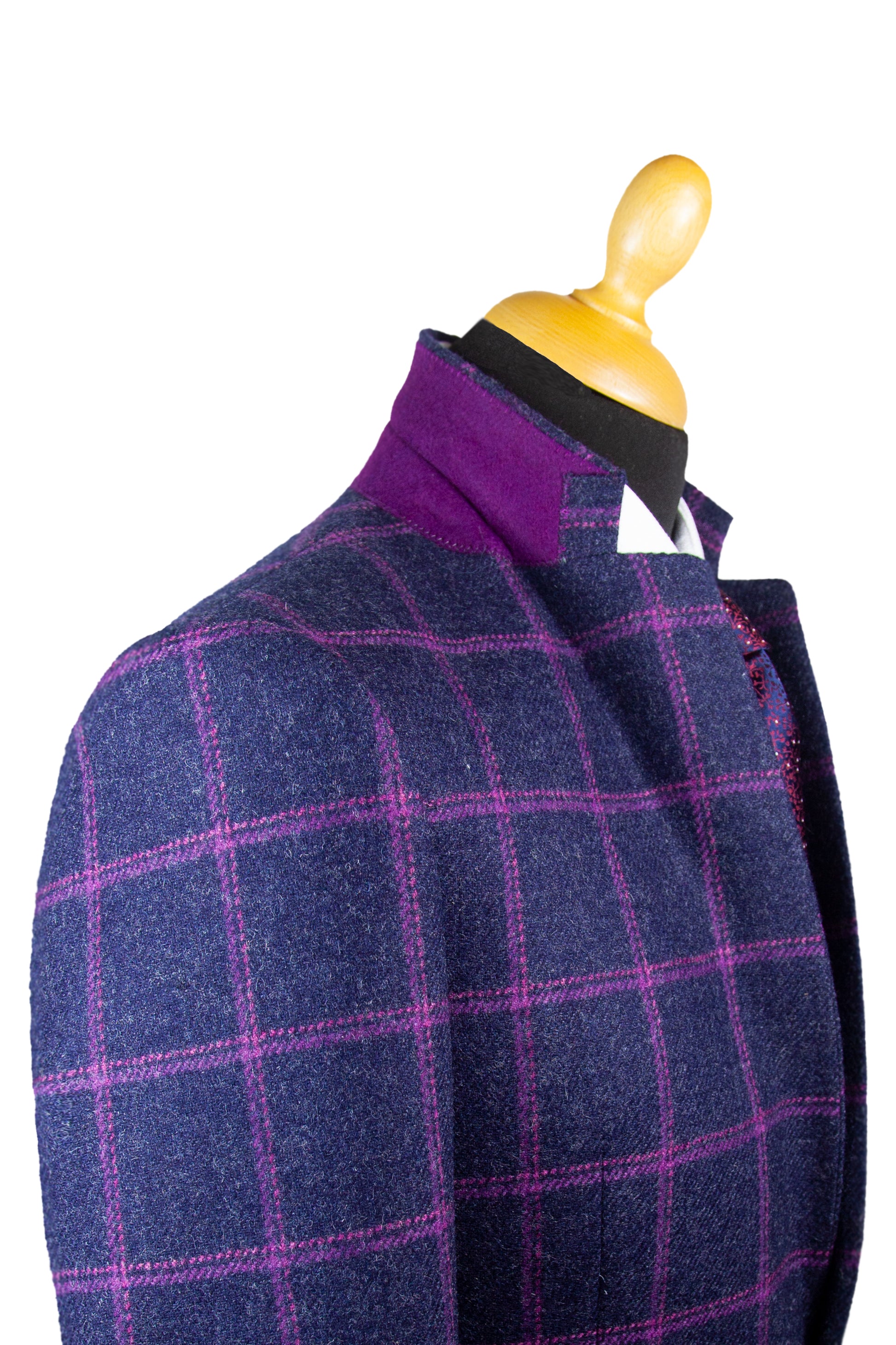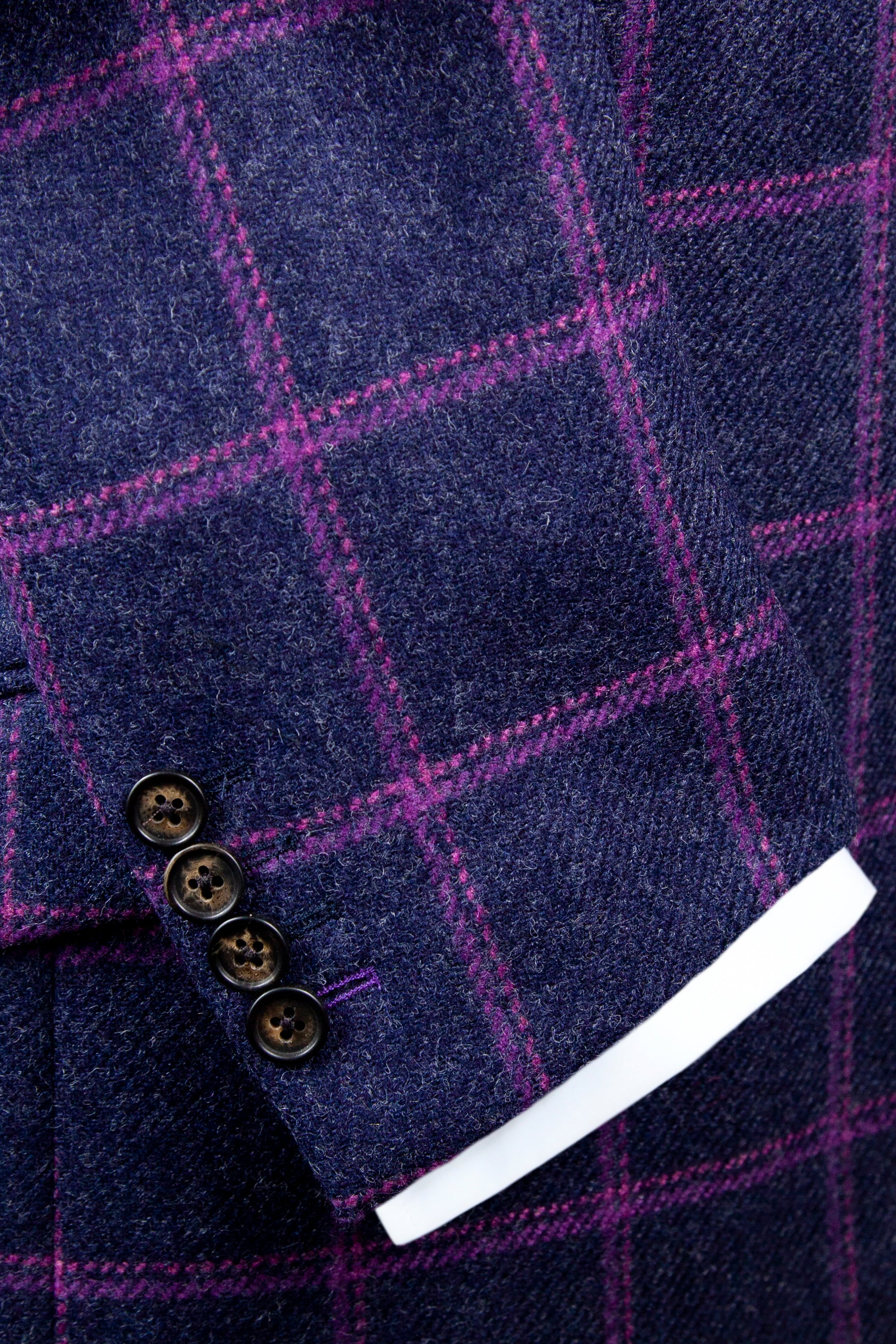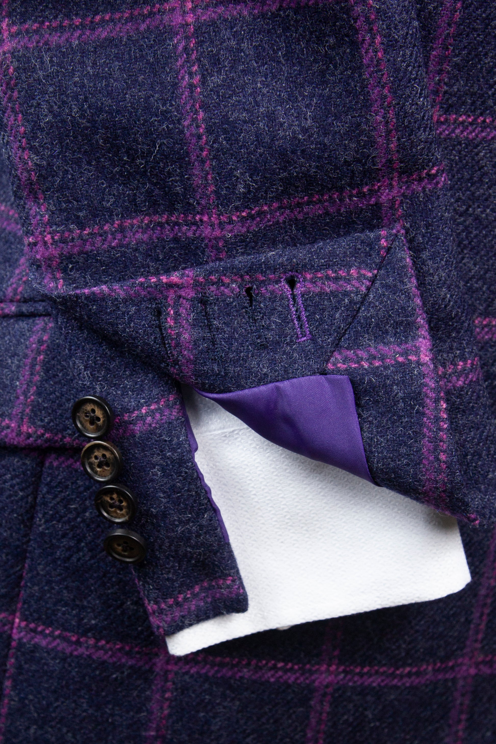 Our 'Edmund' is a tailored fit single breasted English Tweed jacket made of premium pure wool for comfort and durability. It features 4 button working cuffs, piano facing 'Deep Purple' lining, and under collar felt to match the lining colour. This jacket is designed in London and hand woven in England.