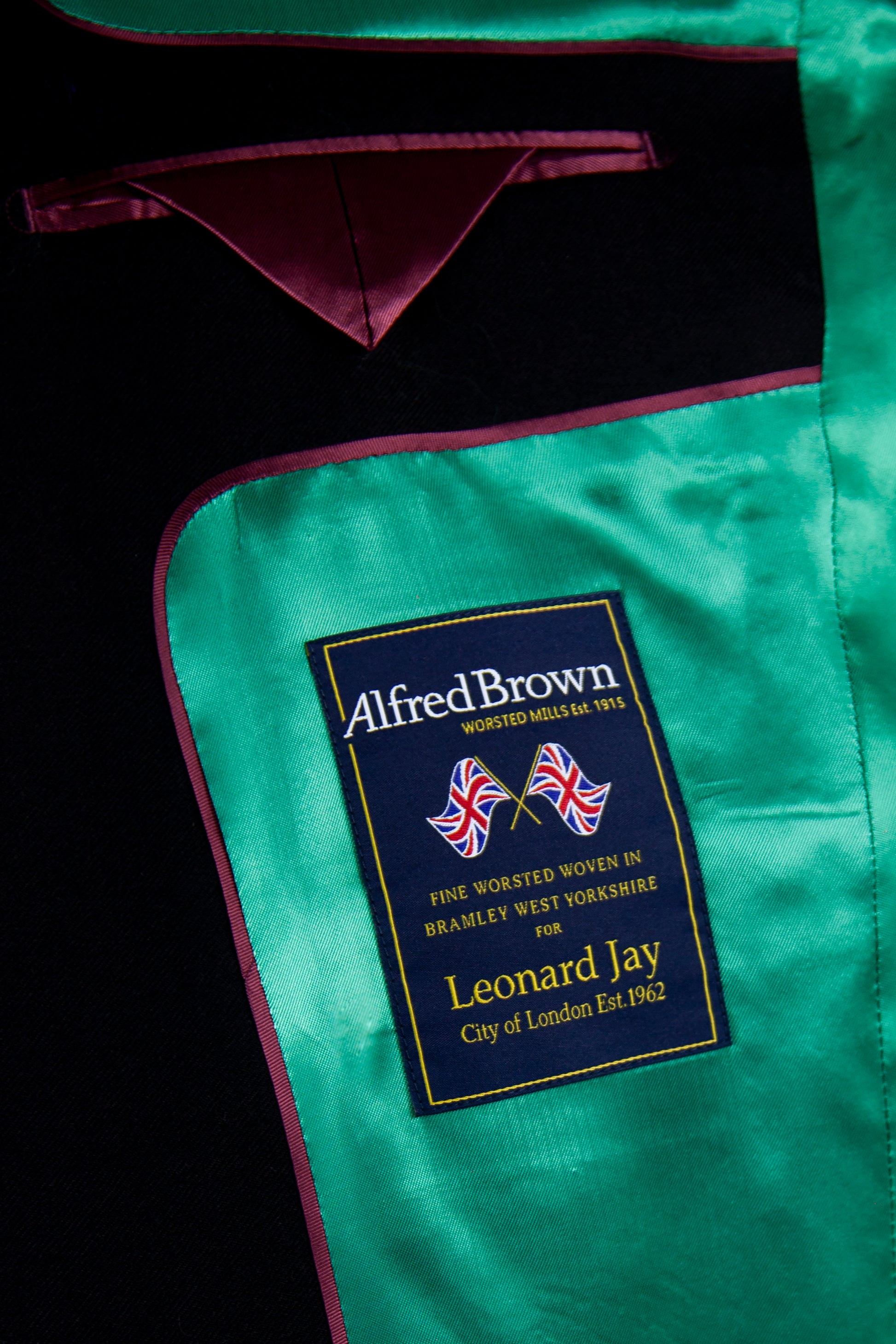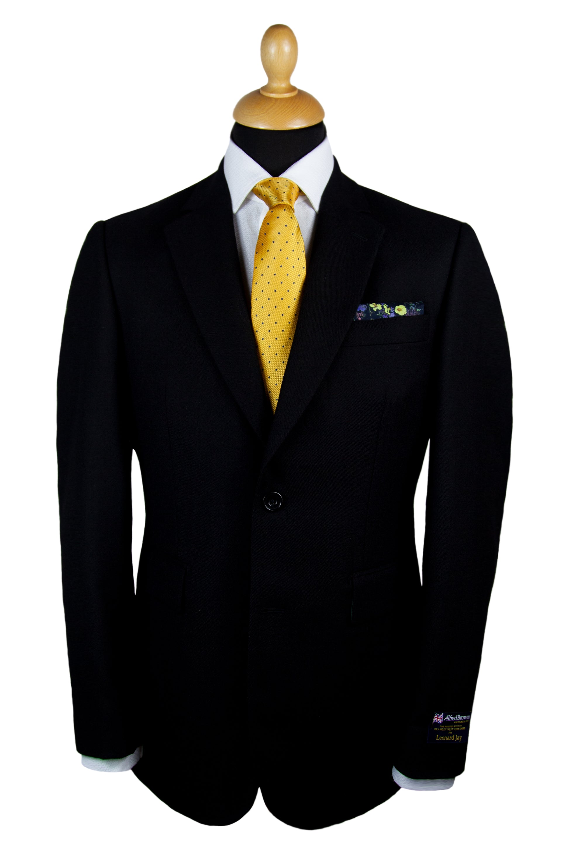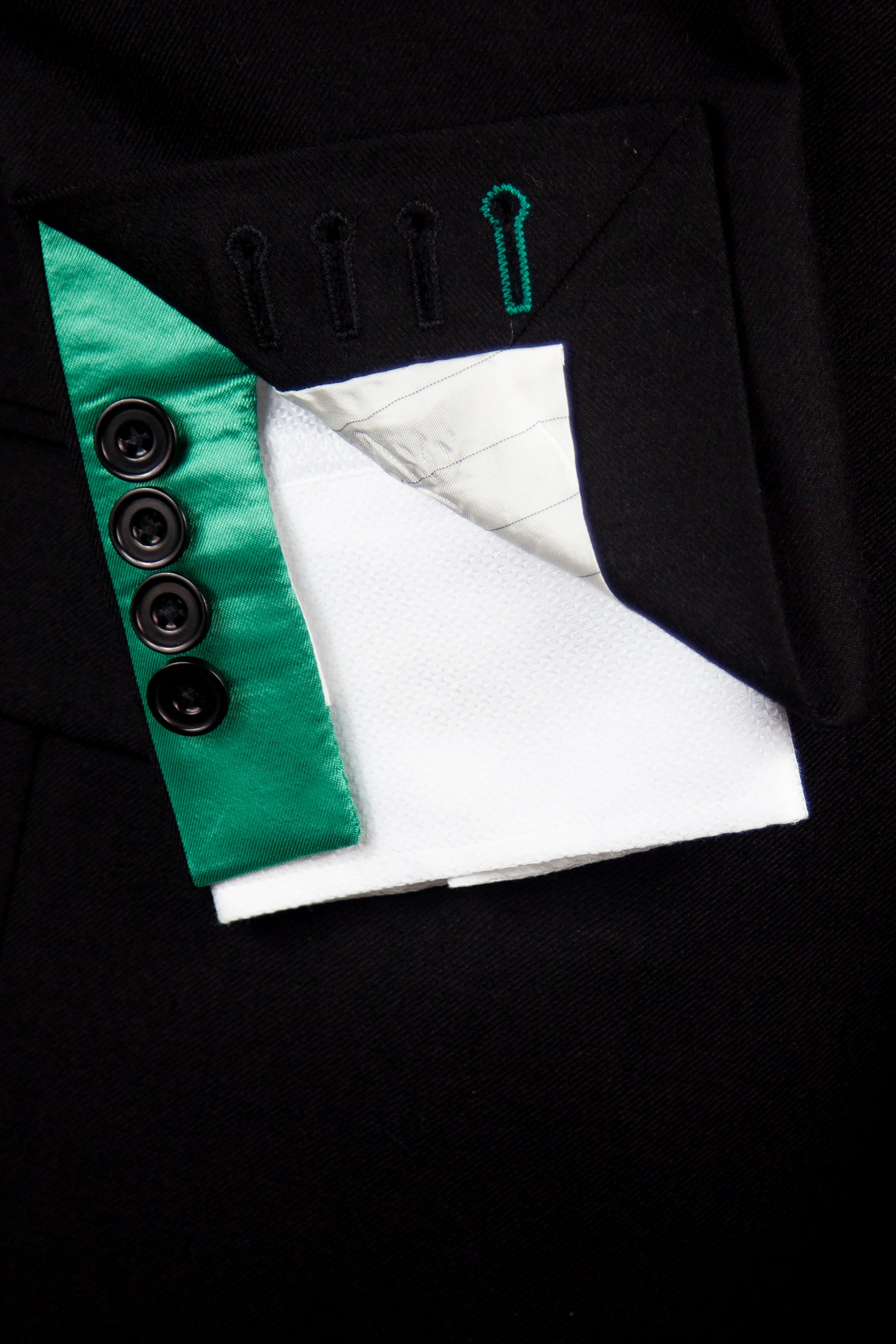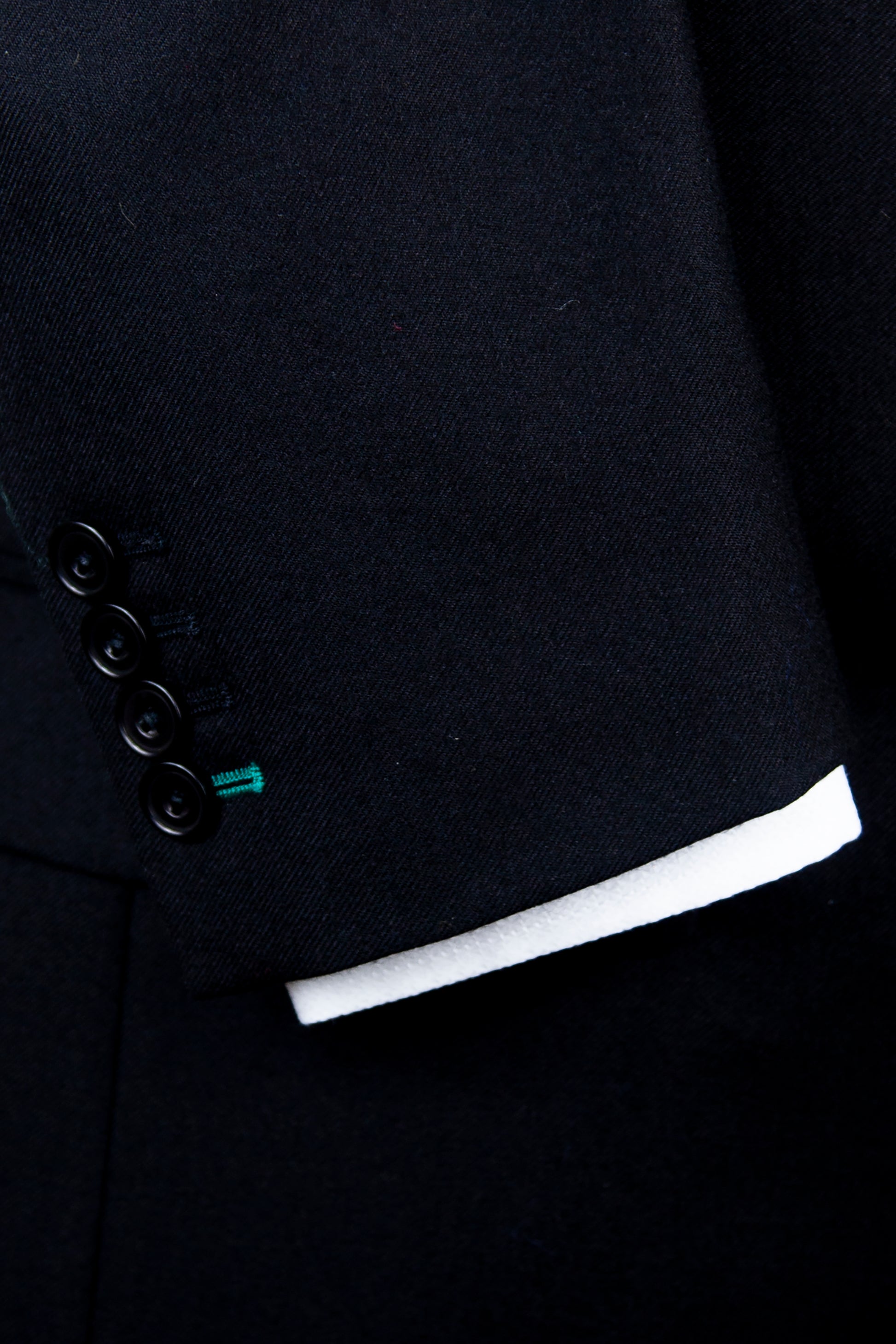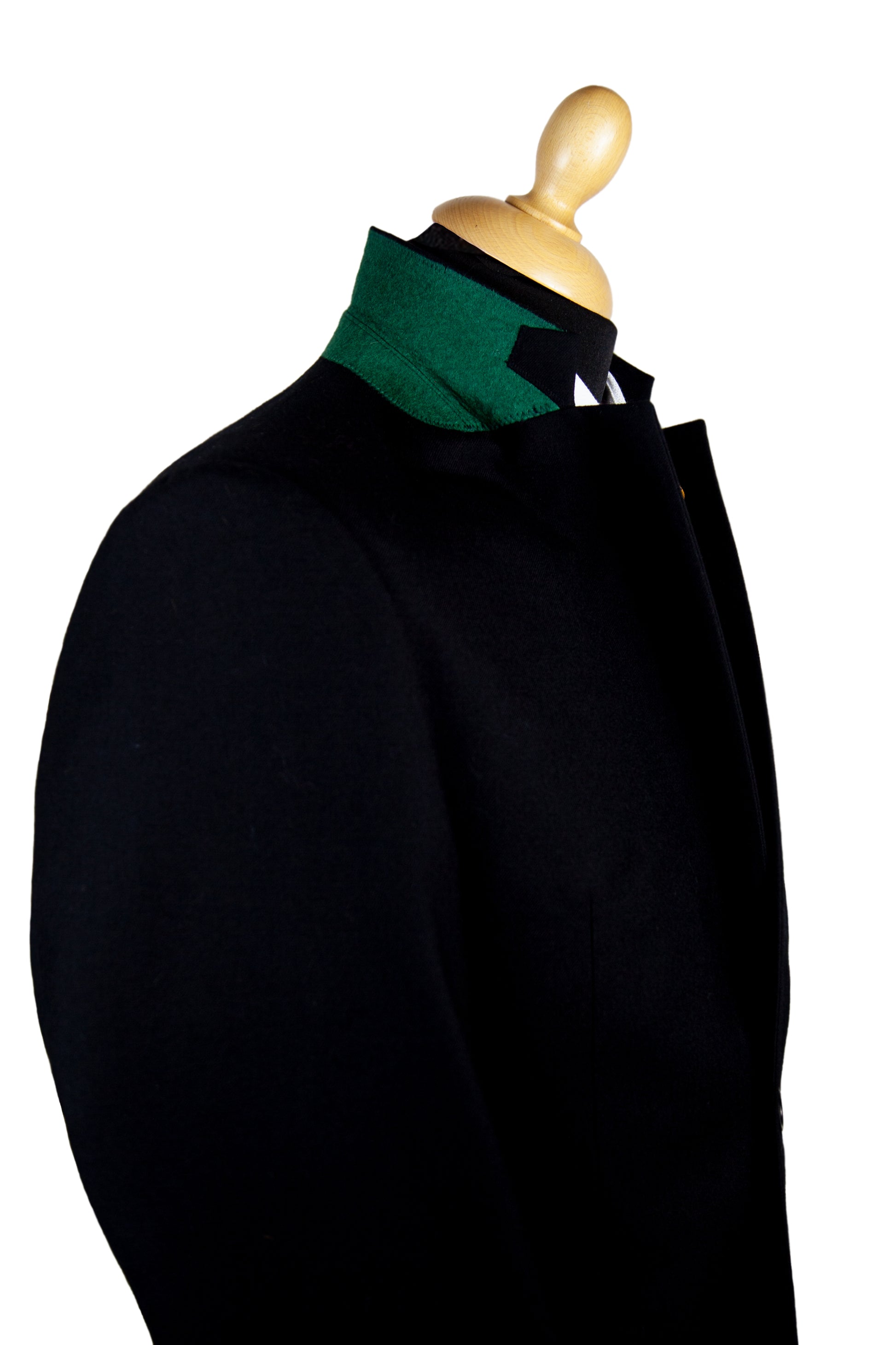 Our 'Haig' is a Black classic fit single breasted suit, made of premium pure wool for comfort and breathability. Jacket features 4 button working cuffs, straight pockets, 100% viscose piano facing Green lining, and Green under collar felt and contrasting sham to match lining. It is complemented by a flat fronted classic fit trouser with belt loops. This suit is designed with London fine worsted woven in Bramley West Yorkshire and made in our High grade European factory.