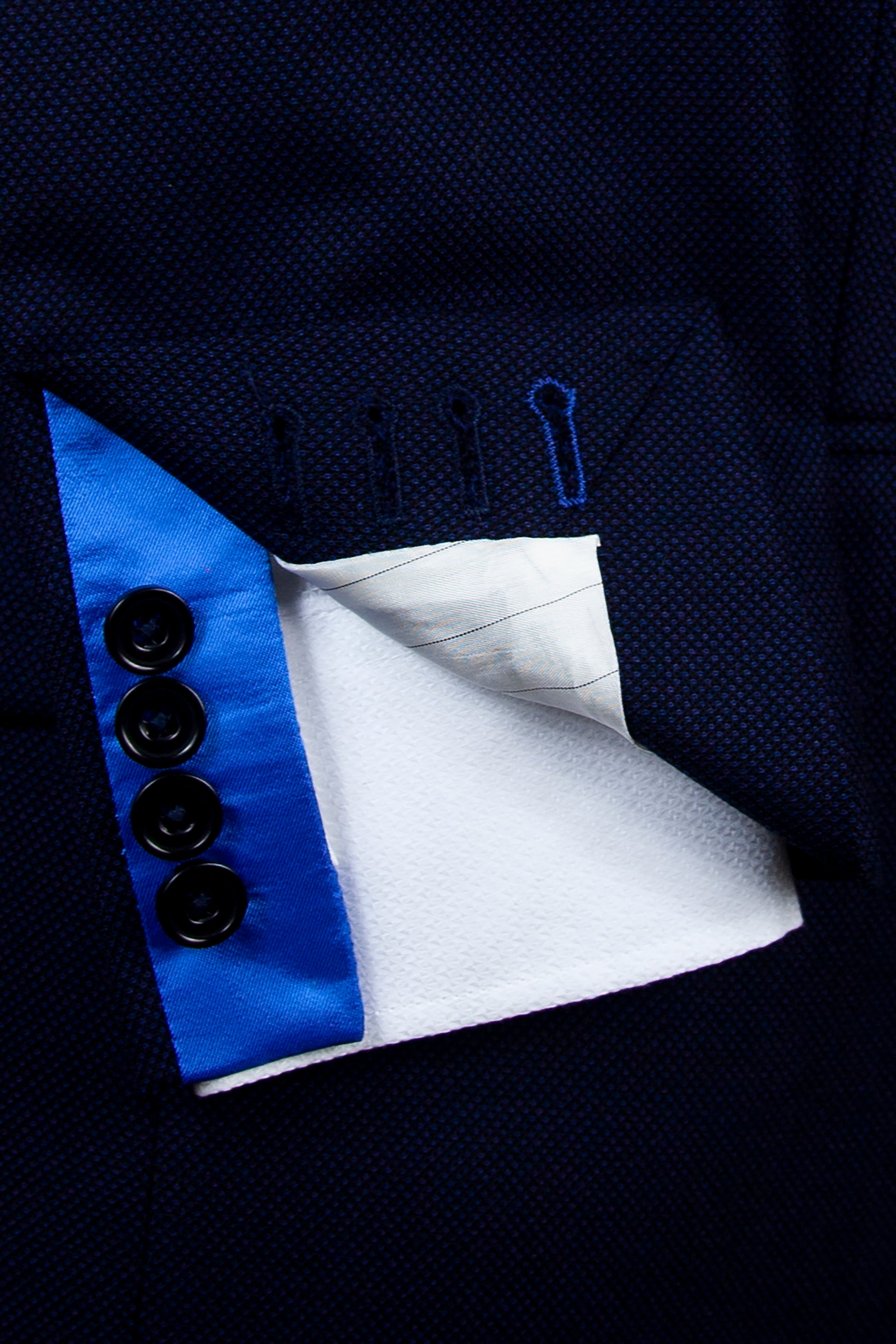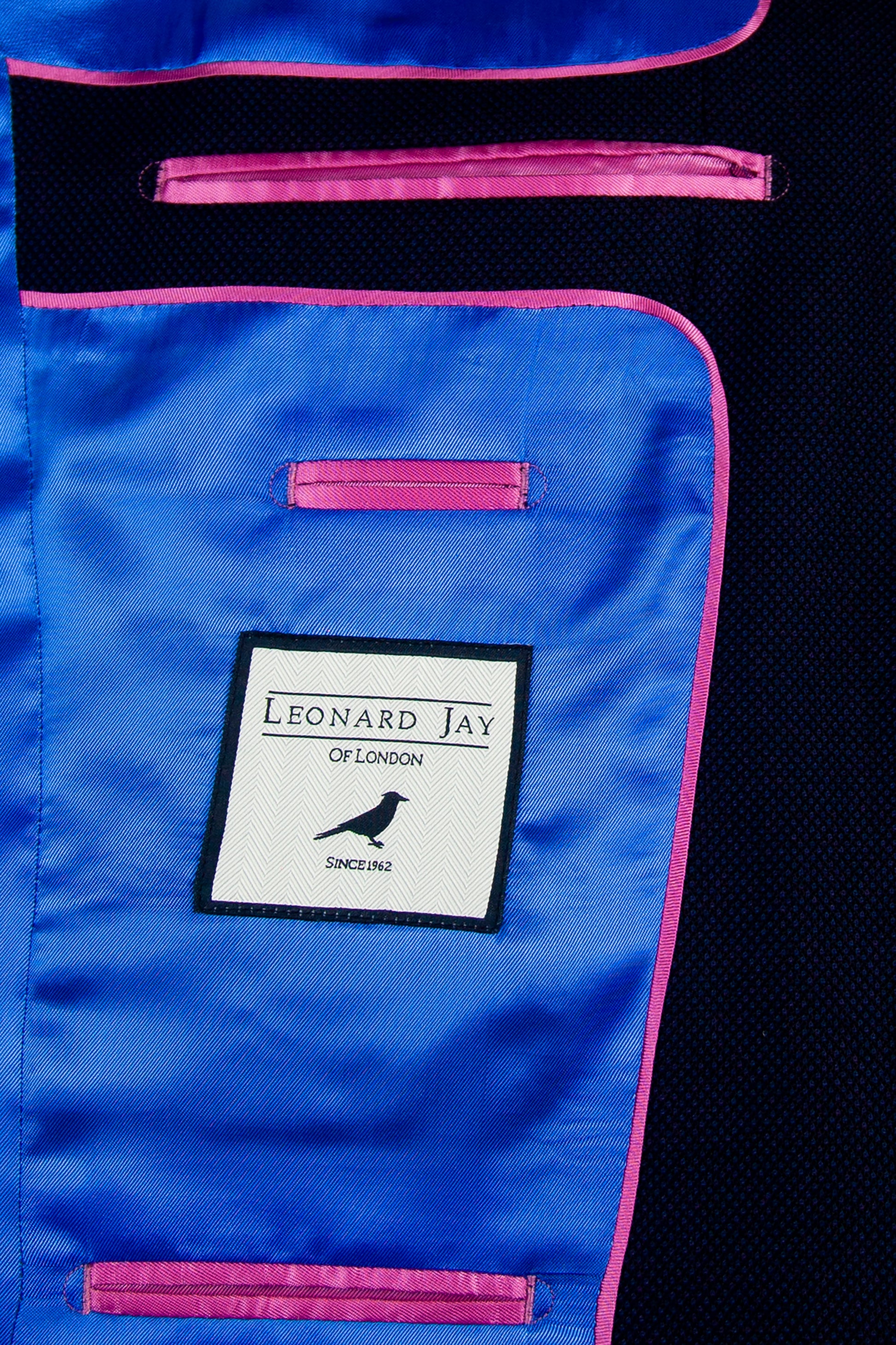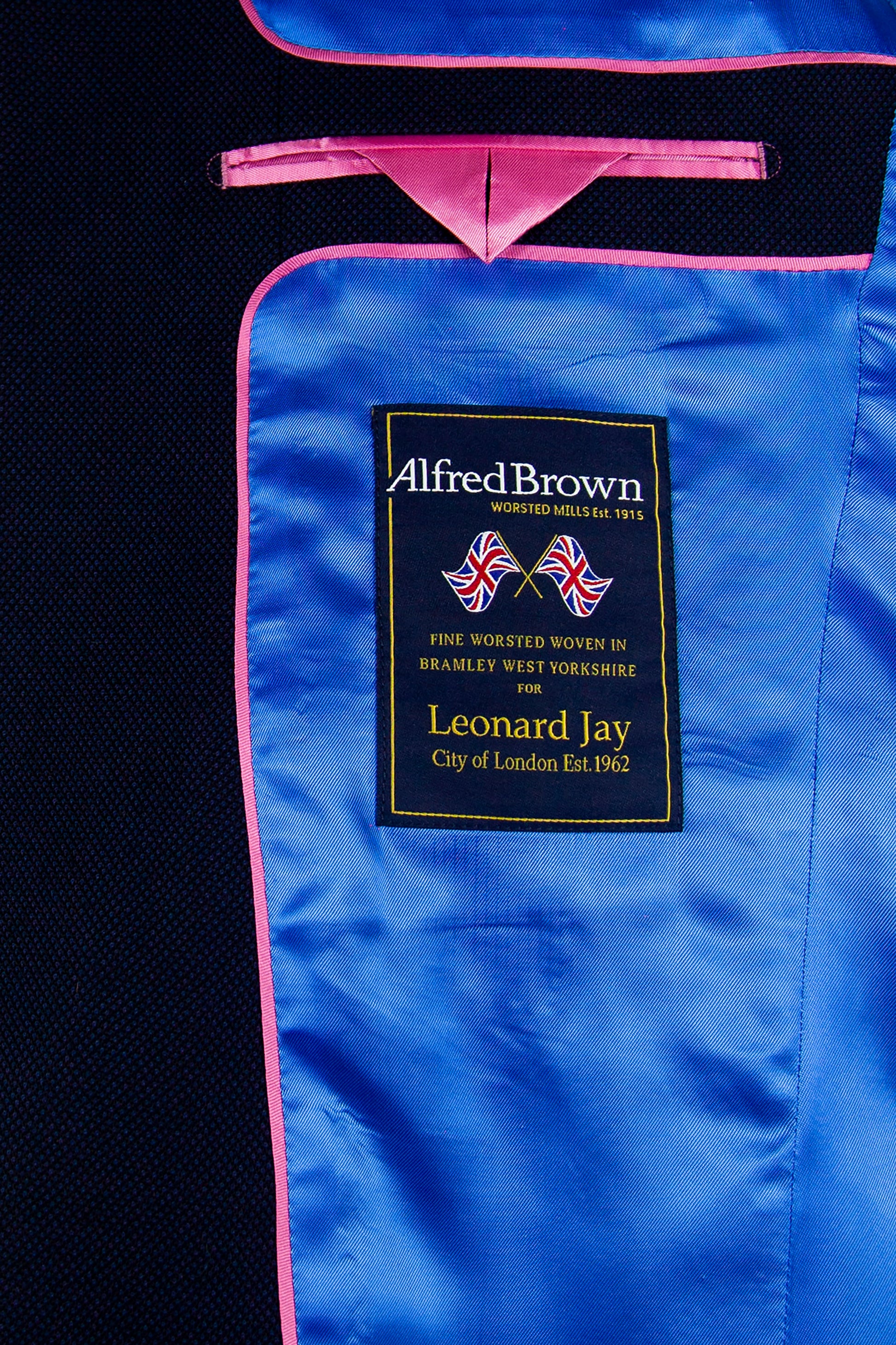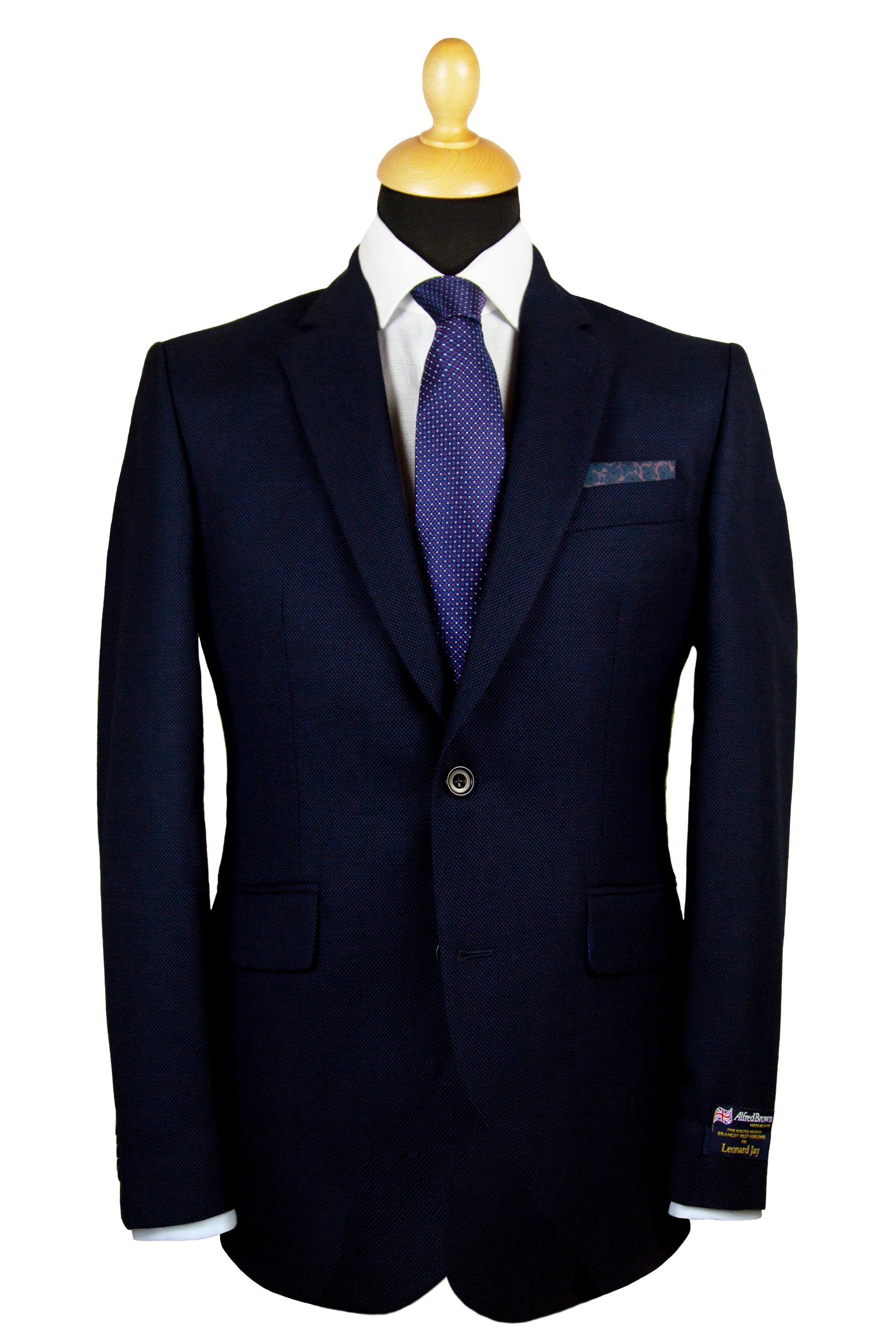 Our 'Montgomery' is a Navy Birdseye classic fit single breasted suit, made of premium pure wool for comfort and breathability. Jacket features 4 button working cuffs, slanted pockets, 100% viscose piano facing Royal Blue lining, and Royal Blue under collar felt and contrasting sham to match lining. It is complemented by a flat fronted classic fit trouser with side adjusters. This suit is designed with London fine worsted woven in Bramley West Yorkshire and made in our High grade European factory.