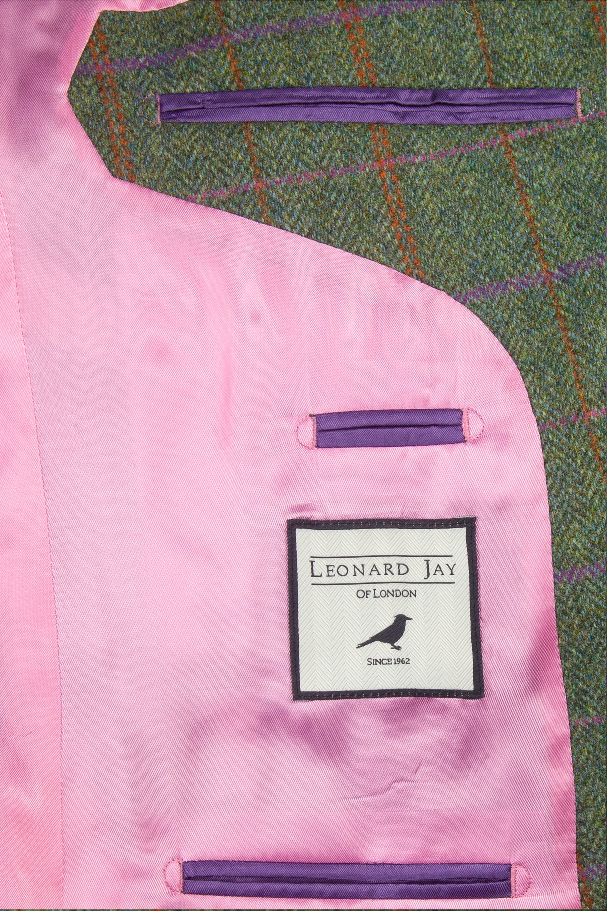 Our 'Phillip' is a tailored fit single breasted English Tweed jacket made of premium pure wool for comfort and durability. It features 4 button working cuffs, piano facing pink lining, and contrasting magenta under collar felt. This jacket is designed in London and hand woven in England.