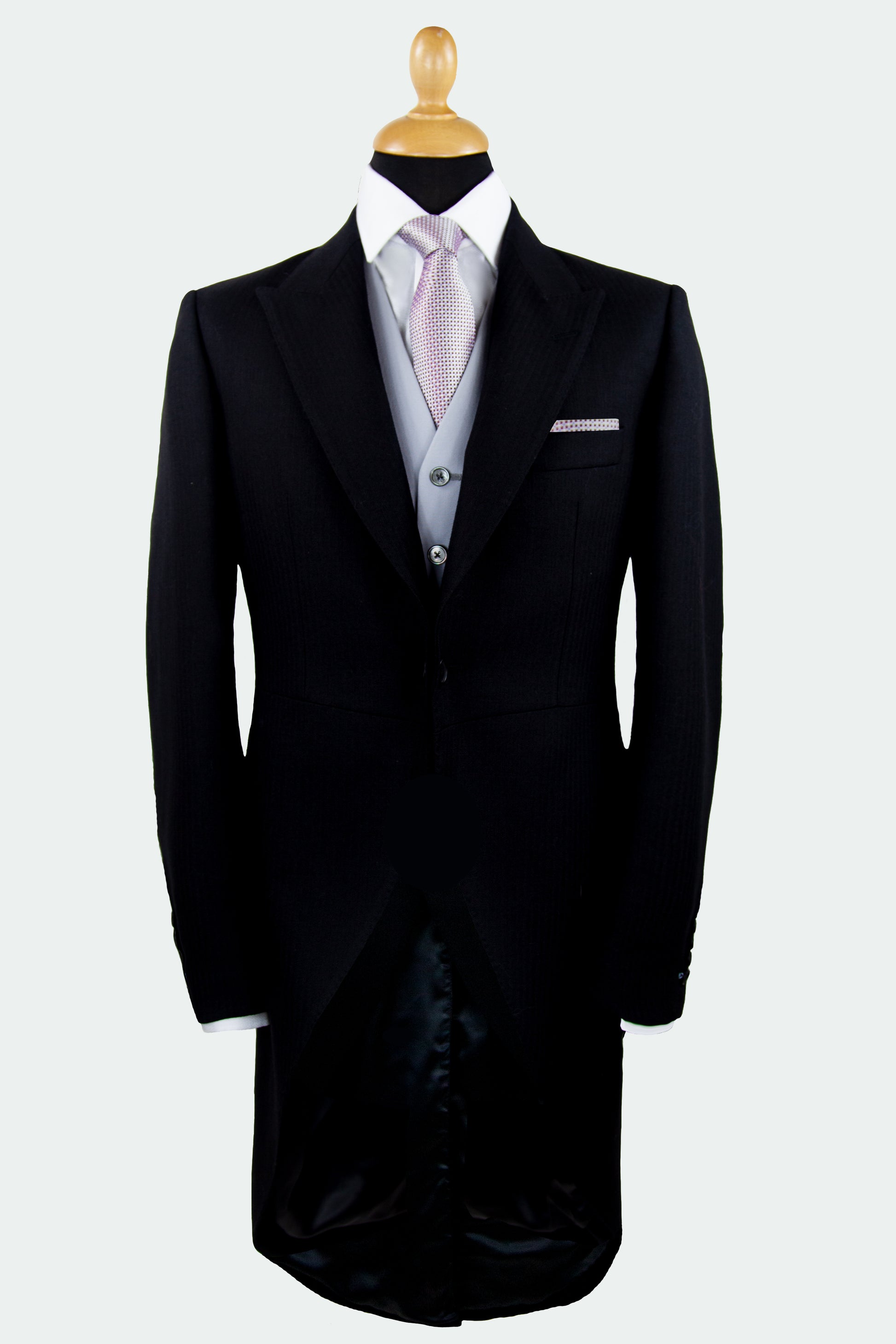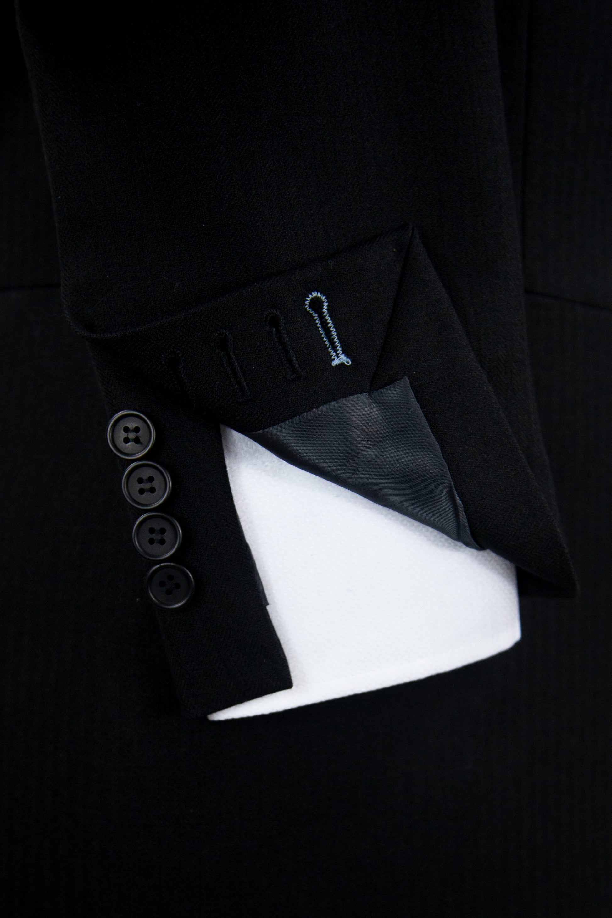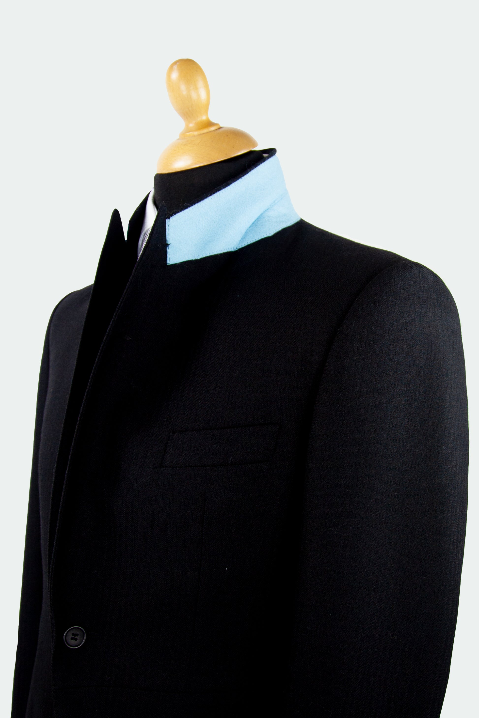 Our 'Ascot' is a tailored fit formal black morning tailcoat, made of 100% premium pure new wool for comfort and breathability. It features peak lapels, 4 button working cuffs and sky-blue contrasting under collar felt. This tailcoat is designed in London and made in Morocco.
